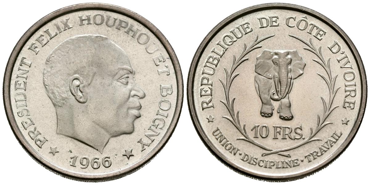COSTA DE MARFIL. 10 Francos. (Ar. 25,01g/34mm). 1966. Presidente Félix Houphouet. (Km#1). PROOF. Escasa.