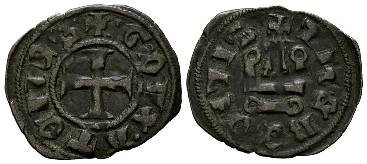 CRUZADAS DE ACHAIA, Guy I de La Roche (1280-1287). Dinero cruzado. (Ve. 0,90g/20mm). Fürstentum. (Metcalf 271-274). Cruz dentro de gráfila, alrededor leyenda: G DVX ATENES. Rev: Castillo, alrededor leyenda: THEBE CIVIS. MBC-.
