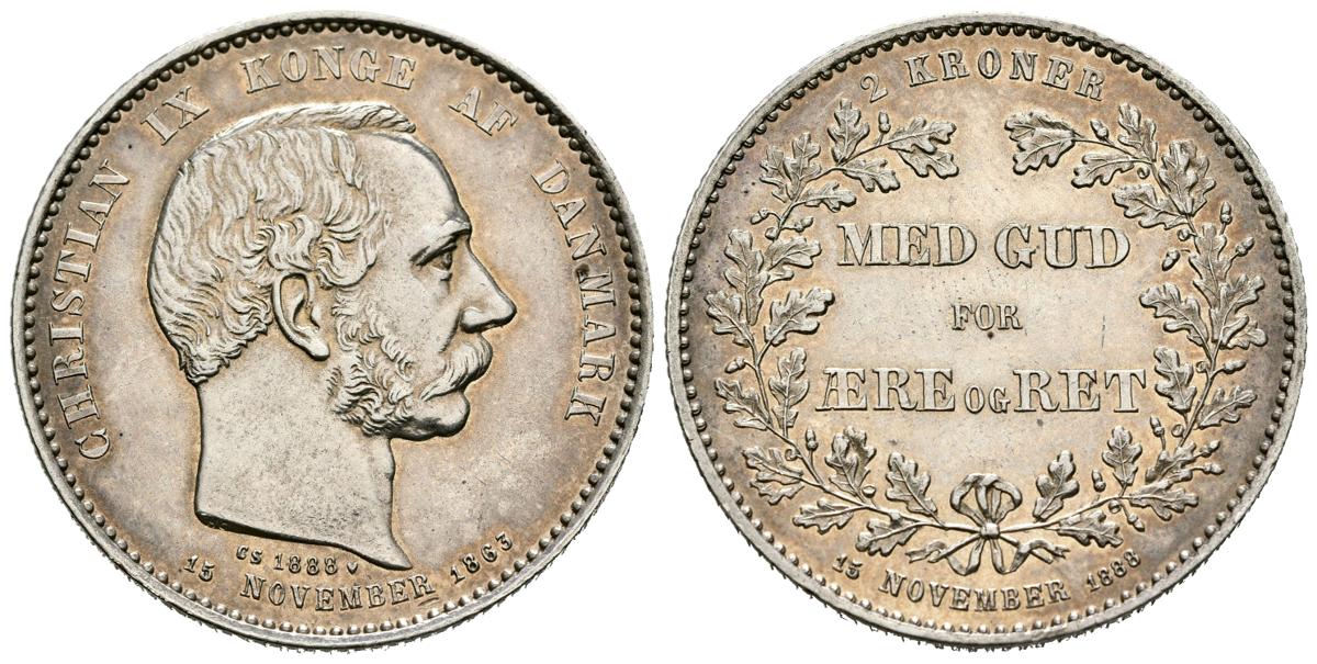 DINAMARCA. 2 Coronas. (Ar. 15,00g/31mm). 1888. Copenhague CS. 25 Aniversario del Reinado de Cristian I. (Km#799). EBC. Limpiada.