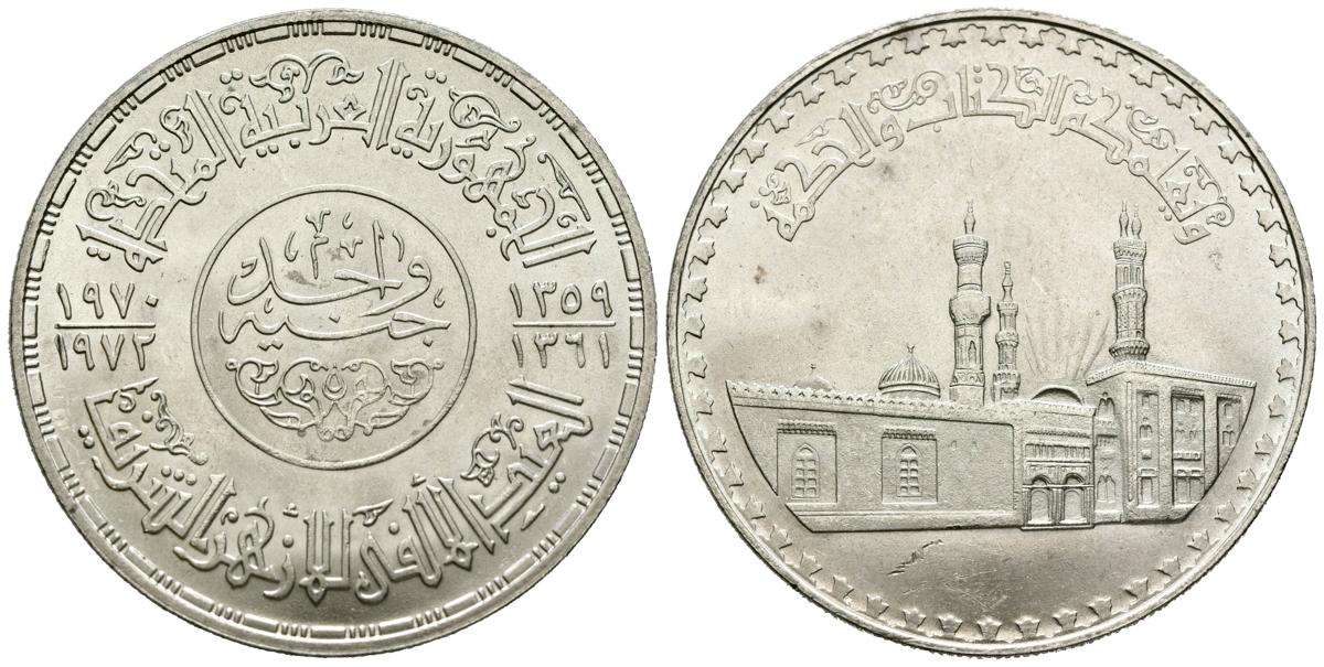EGIPTO. 1 Libra. (Ar. 24,96g/40mm). 1970-1972. Mezquita de Al-Azhar. (Km#424). SC-. Ligeras marquitas.