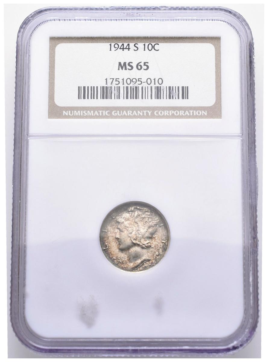 ESTADOS UNIDOS. 10 Cent (Ar. 2,50g/18mm)*. 1944. San Francisco S. Mercury Dime. (Km#140). Encapsulada por NGC MS65. *Pesos y medidas teóricos.