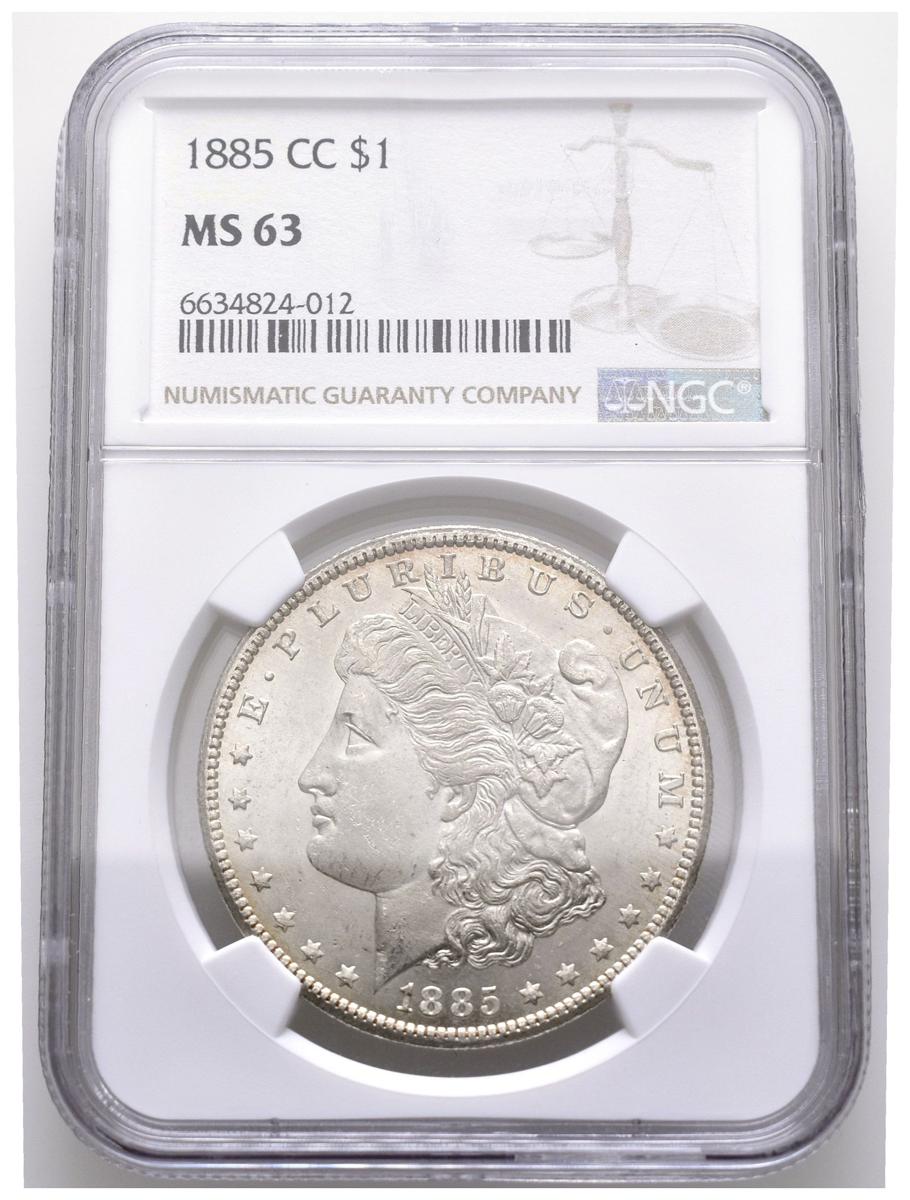 ESTADOS UNIDOS. 1 Dollar (Ar. 26,73g/38mm)*. 1885. Carson City CC. (Km#110). Encapsulada por NGC MS63. *Pesos y medidas teóricos.