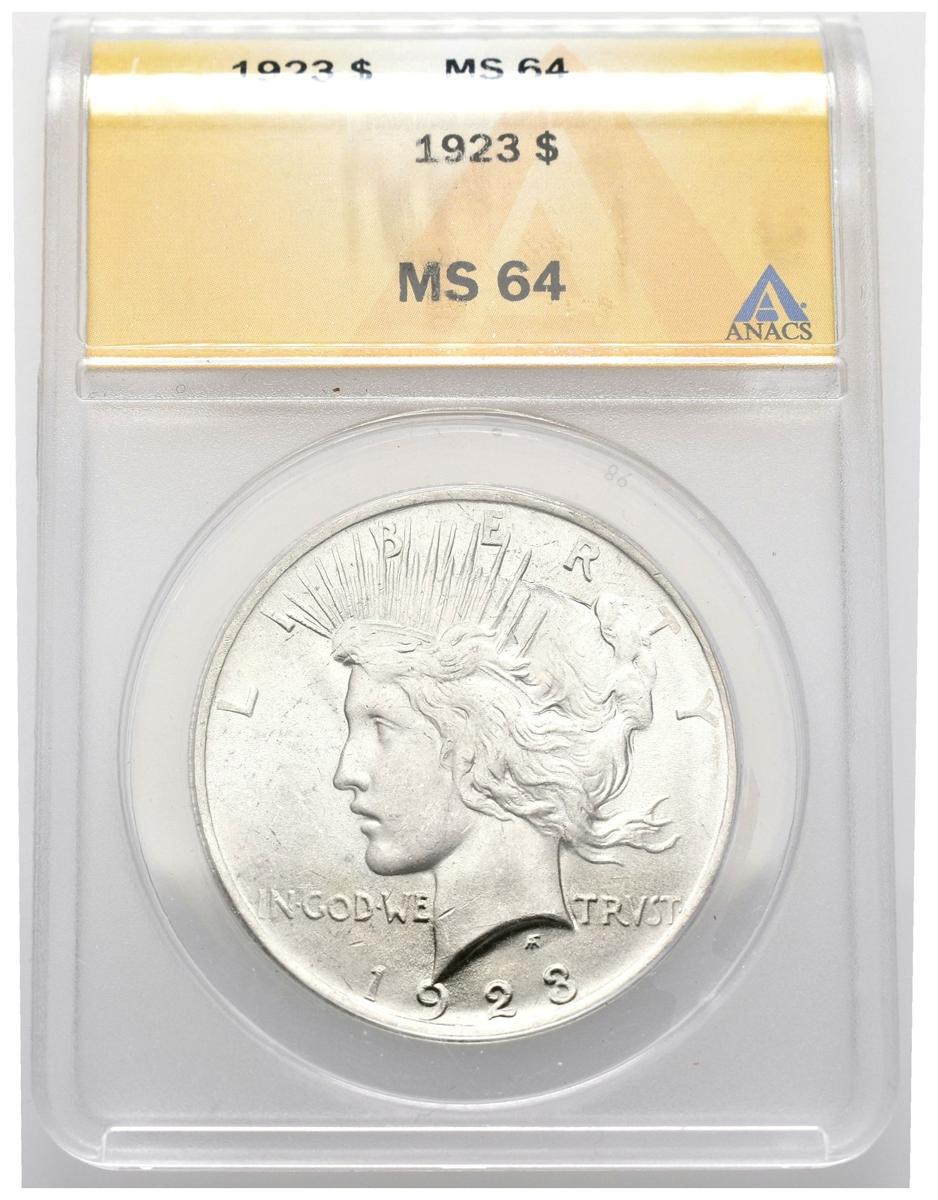 ESTADOS UNIDOS. 1 Dollar (Ar. 27,00g/38mm)*. 1923. Philadelphia. (Km#150). MS64. Encapsulada por ANACS. * Peso y medida teórico.