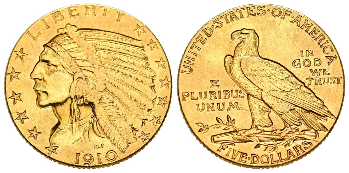 ESTADOS UNIDOS. 5 Dollars (Au. 8,37g/21mm). 1910 Philadelphia. Cabeza de Indio. (Km#129). MBC+.