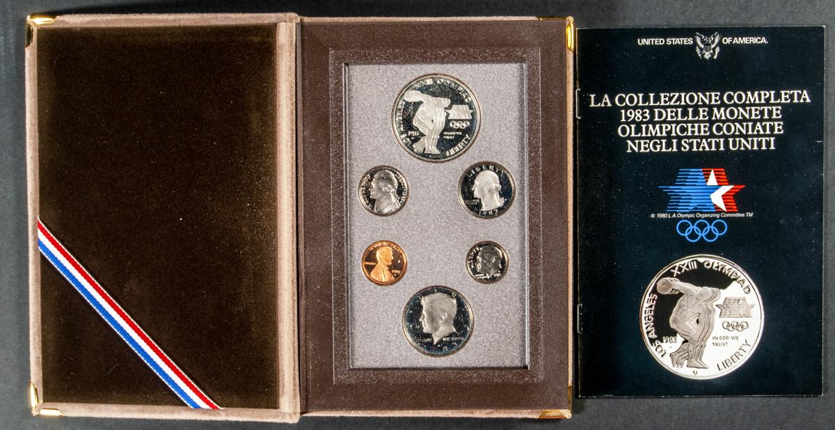 ESTADOS UNIDOS. Estuche oficial compuesto por 6 Monedas conmemorativas de los JJOO de Los Ángeles 84. 1983. San Francisco S. Valores comprendidos entre 1 Centavo y 1 Dollar y diversos materiales incluyendo la plata con calidad PROOF para el Dollar. Incluye certificado de autenticidad de la United State Mint.