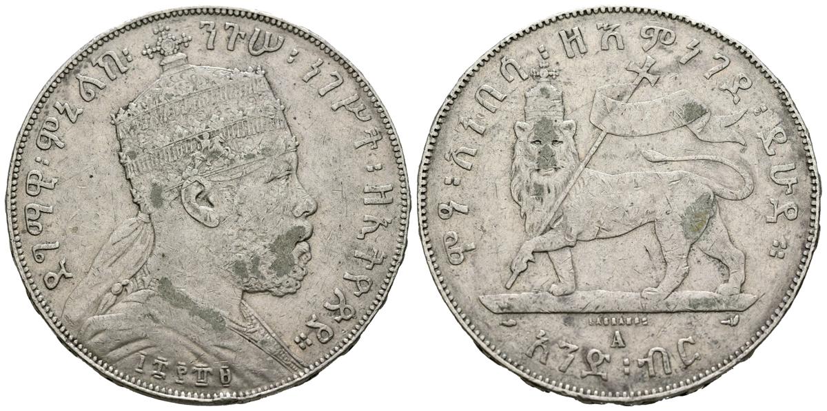 ETIOPÍA, Menelik II. 1 Birr. (Ar. 28,05g/40mm). 1889 EE (1896-1897). París A. (Km#19). MBC.