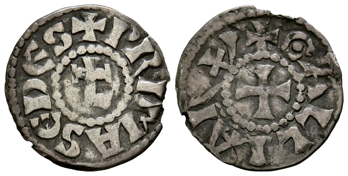 FRANCIA, Arzobispado de Lyon (1100-1150). Dinero. (Ar. 1,05g/18mm). Lyon. (Duplessy 2537). Anv: L sobre cruz dentro de gráfila, alrededor leyenda: PRIMA SEDES. Rev: Cruz dentro de gráfila, alrededor leyenda: GALLIARV. MBC.