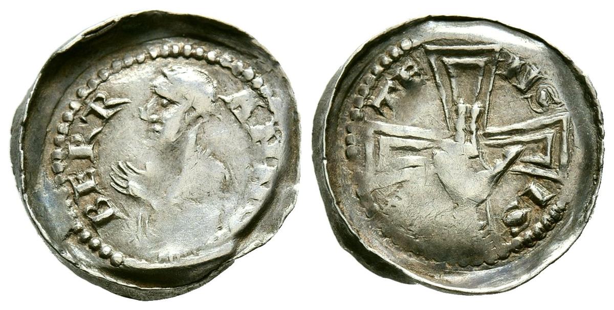 FRANCIA, Obispo Bertram (1180-1212), 59º Obispo de Metz. Dinero. (Ar. 0,72g/15mm). Metz. (Boudeau 1625). Anv: Busto del obispo Bertram rezando a izquierda, alrededor leyenda: BERTRANN. Rev: Mano delante de cruz, alrededor leyenda: METENSIS. MBC.