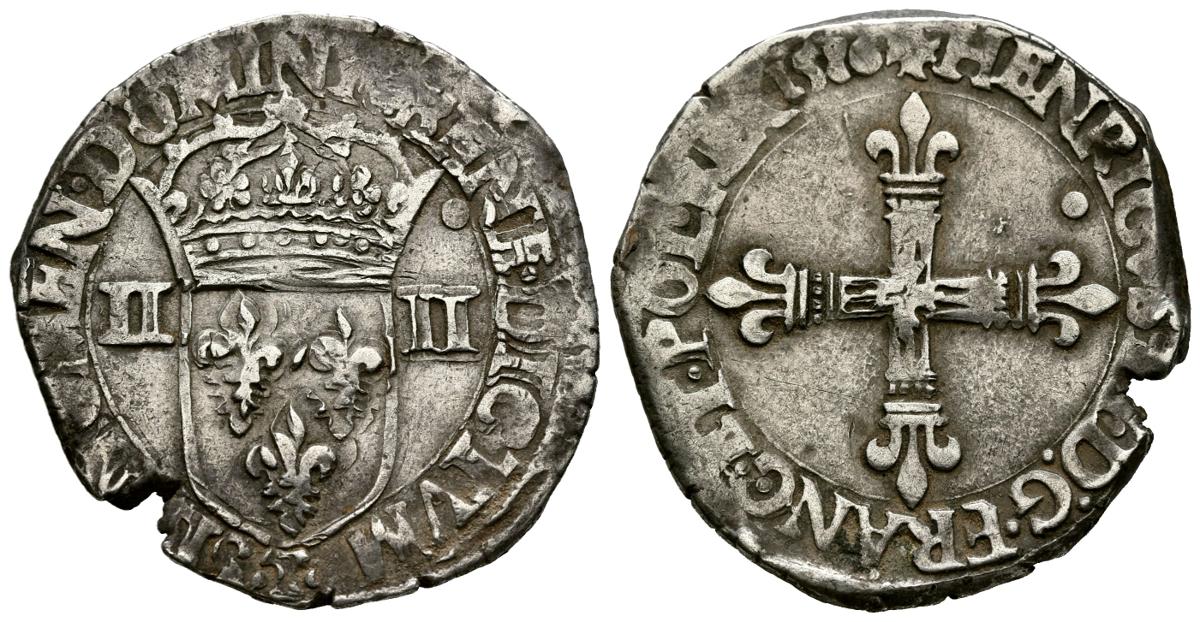 FRANCIA. 1/4 Ecu. (Ar. 9,60g/29mm). 1586. Enrique III. Nantes T. MBC+. Cospel faltado.
