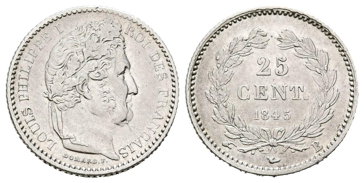 FRANCIA. 25 Céntimos (Ar. 1,25g/15mm). 1845. Rouen B. (Km#755.2). EBC. Limpiada.
