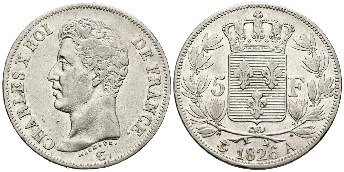 FRANCIA. 5 Francos. (Ar. 24,77g/37mm). 1826. Carlos X. París A. (Km#720.1). MBC+. Marquitas.