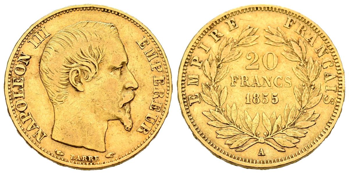 FRANCIA. 20 Francos (Au. 6,45g/21mm). 1855. Napoleón III. París A. (Km#781.1). MBC.
