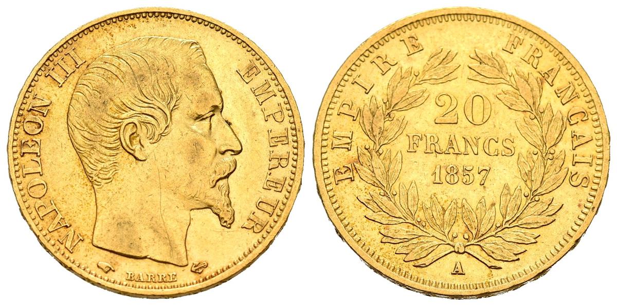 FRANCIA. 20 Francos (Au. 6,47g/21mm). 1857. Napoleón III. París A. (Km#781.1). MBC+.