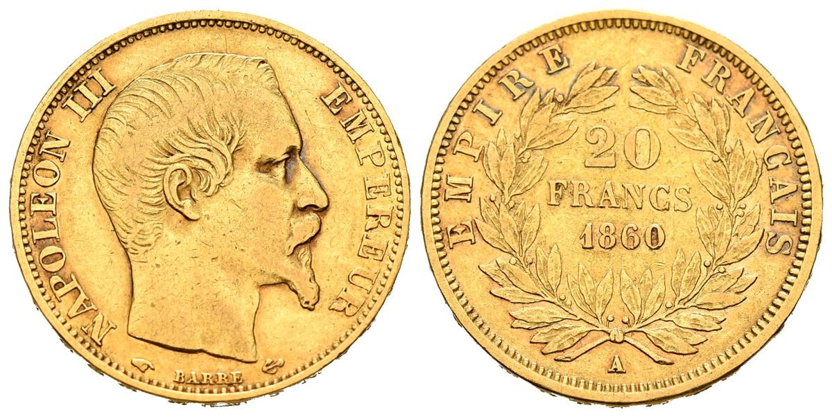 FRANCIA. 20 Francos (Au. 6,40g/21mm). 1860. Napoleón III. París A. (Km#781.1). MBC.