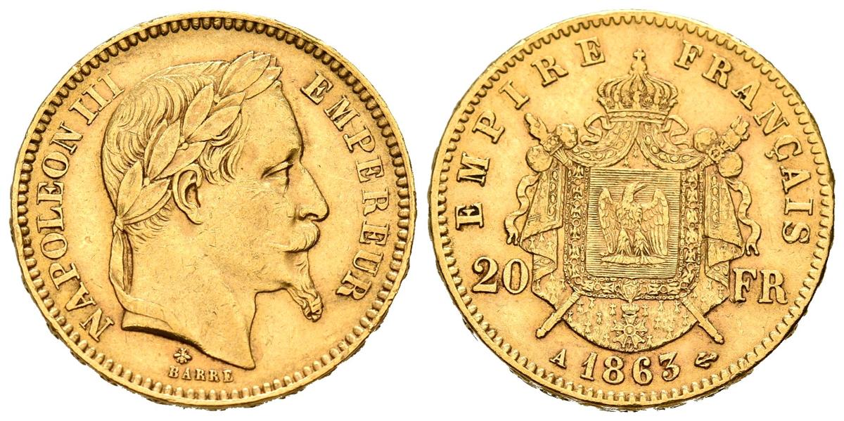 FRANCIA. 20 Francos (Au. 6,40g/21mm). 1863. Napoleón III. París A. (Km#801.1). MBC.