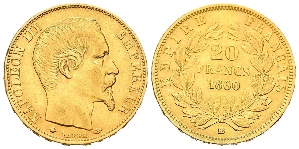FRANCIA. 20 Francos (Au. 6,43g/21mm). 1860. Napoleón III. Estrasburgo BB. (Km#781.2). MBC+.