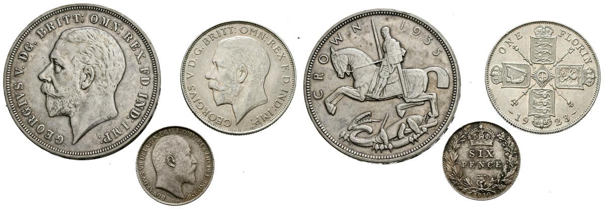 GRAN BRETAÑA. Interesante conjunto de 3 piezas en plata de 1 Corona, 1 Florín y 6 Peniques acuñadas entre 1910 y 1935 (épocas de Eduardo VII y Jorge V). Diferentes estados de conservación. A EXAMINAR.
