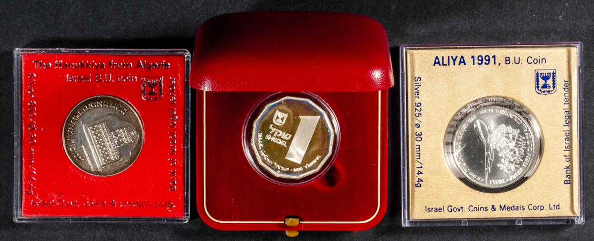 ISRAEL. Bonito conjunto de 3 monedas en plata de 1 Schekel acuñadas en 1985, 1986 y 1991. Incluye estuches originales y certificados de autenticidad. SC. A EXAMINAR.