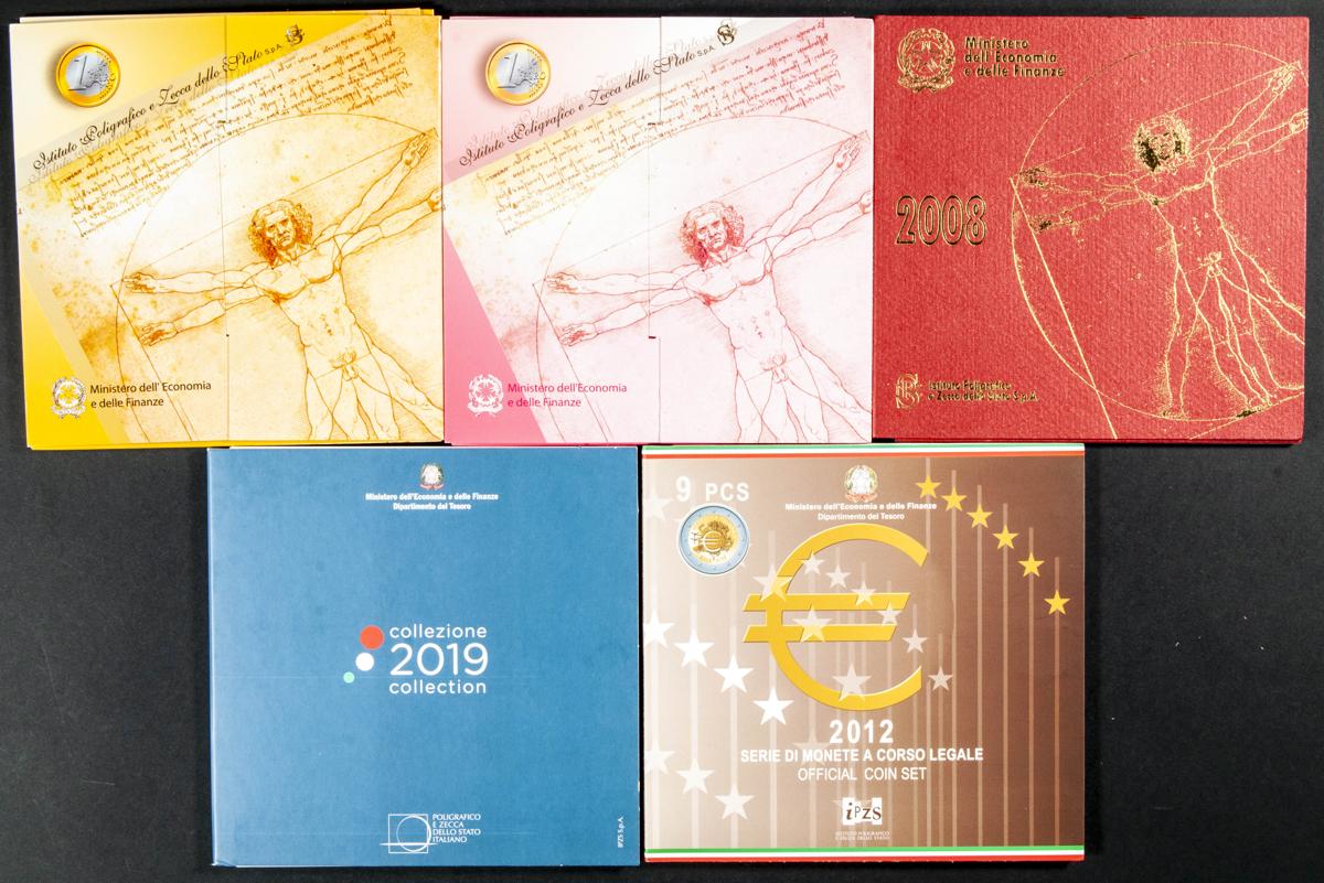 ITALIA. Colección compuesta por 5 carteras oficiales de Euros con fechas de: 2005,2007,2008,2012 y 2019. SC.