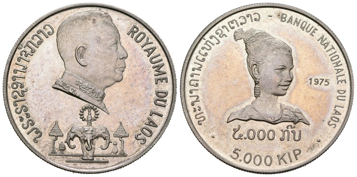 LAOS. 5000 Kip. (Ar. 11,70g/30mm). 1975. Savang Vatthana. (Km#16.1). PROOF. Levísimas marquitas. Pátina. Muy escasa.