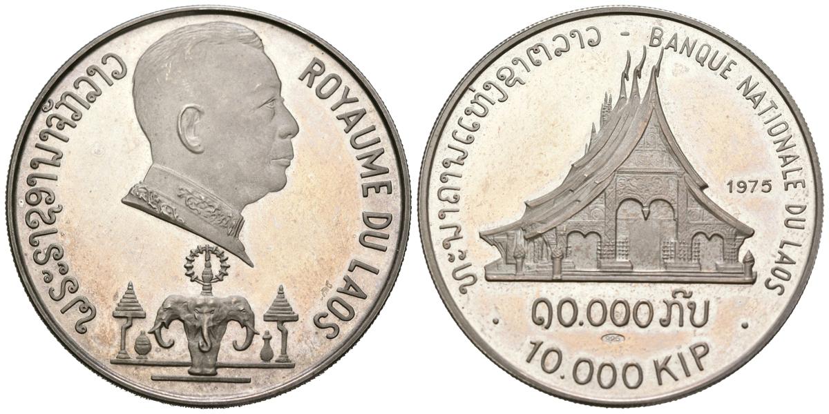 LAOS. 10.000 Kip. (Ar. 23,46g/40mm). 1975. Templo de Wat Xieng Thong. (Km#18). PROOF. Levísimas marquitas. Muy escasa.