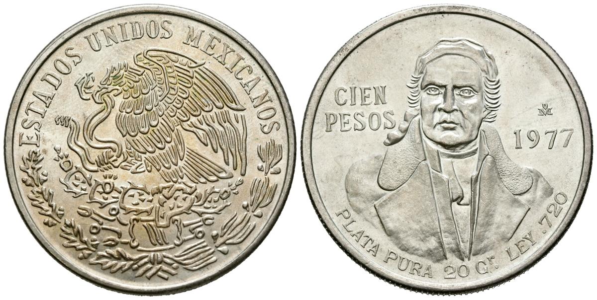 MÉXICO. 100 Pesos. (Ar. 27,76g/39mm). 1977. (K# 483.1). SC-. Marquitas en anverso.