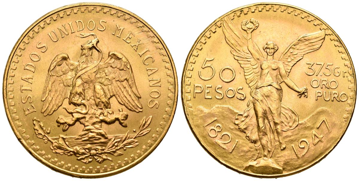 MÉXICO. 50 Pesos. (Au. 41,63g/37mm). 1947. (Km#481). EBC+. Ligeras marquitas.