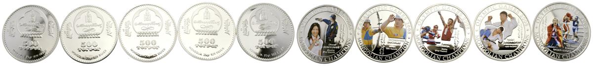 MONGOLIA. Conjunto de 5 monedas acuñadas en plata de 500 Tugrik en conmemoración de campeones olímpicos en 2008. PROOF. Incluyen certificados originales. A EXAMINAR.