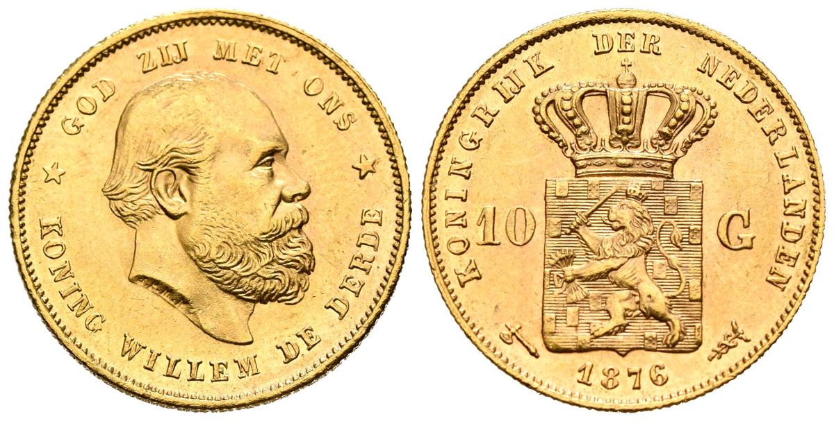PAÍSES BAJOS. 10 Gulden. (Au, 6,72g/22mm). 1876. Gillermo III. (Km#106). EBC. Ligeras marquitas.