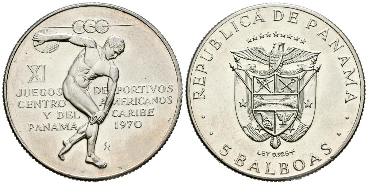 PANAMÁ. 5 Balboas. (Ar. 36,04g/39mm). 1970. Juegos Deportivos Centro Americanos y del Caribe. (Km#28). SC-. Marquitas en reverso.