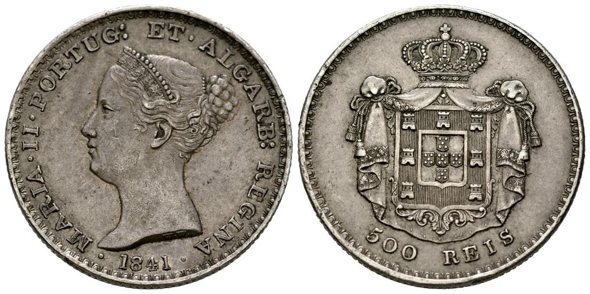PORTUGAL, María II. 500 Reis. (Ar. 14,79g/30mm). 1841. (Gomes 39.04). MBC+. Bonita pátina.