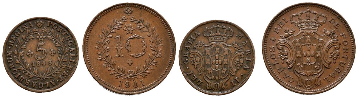 PORTUGAL. Pareja de 5 y 10 Reis acuñados en 1843 (María II) y 1901 (Carlos I). Azores. Diferentes estados de conservación. A EXAMINAR.