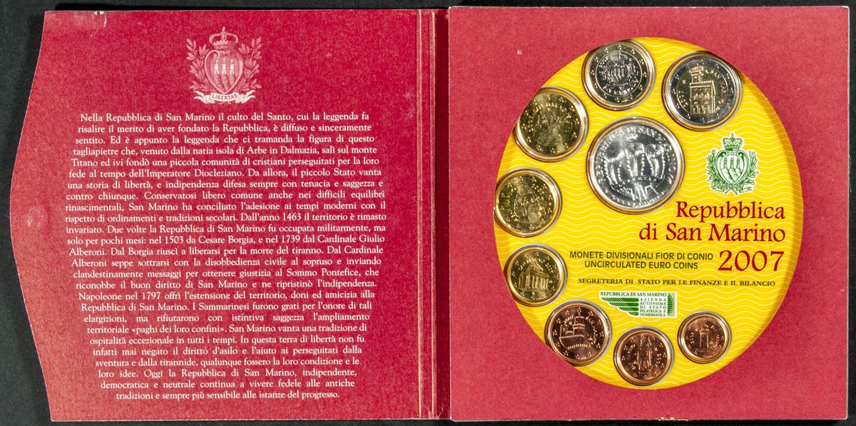 SAN MARINO. Cartera oficial con 9 valores (incluye el valor de 5 Euros en plata) del año 2007. SC.