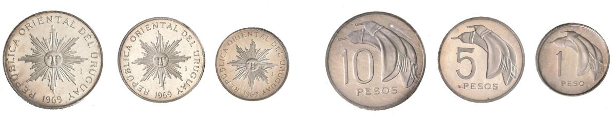 URUGUAY. Conjunto compuesto por 3 ensayos en plata de 0.900 milésimas y con valores de 1, 5 y 10 pesos. 1969. Banco Central del Uruguay. SC. El conjunto se presenta en un sobre de PVC termosellado.