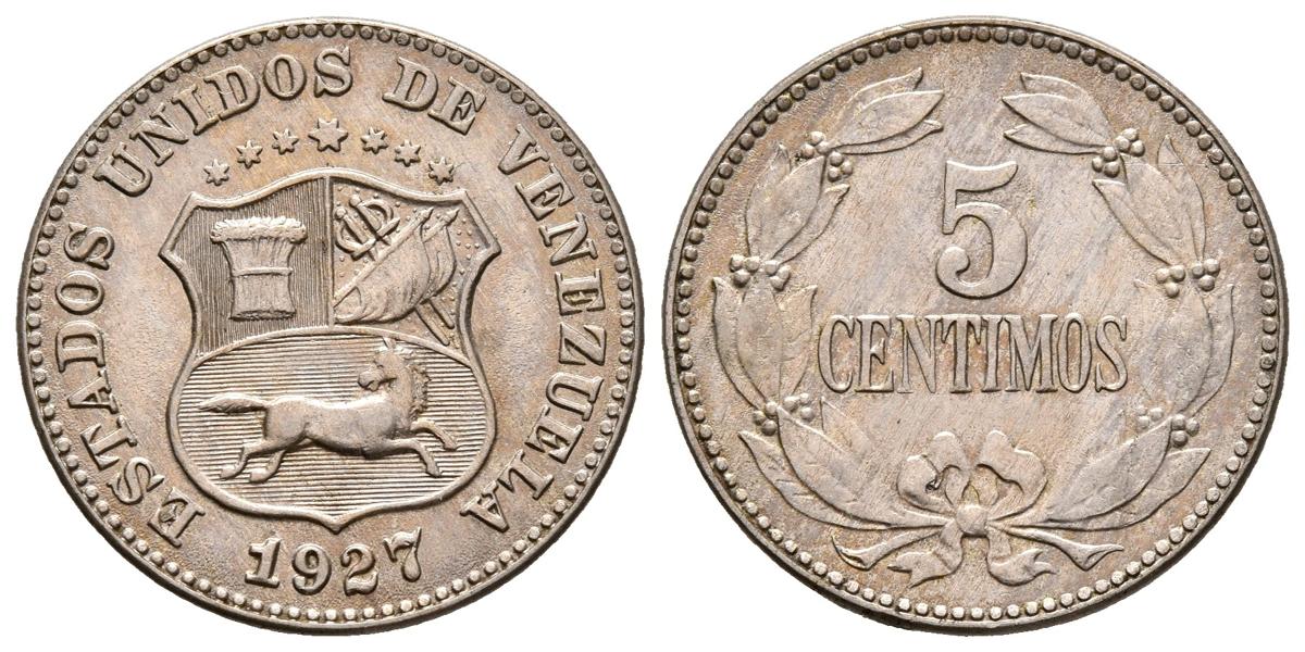 ESTADOS UNIDOS DE VENEZUELA. 5 Céntimos. (CuNi. 2,25g/19mm). 1927. Philadelphia. (Km#Y27). SC-.