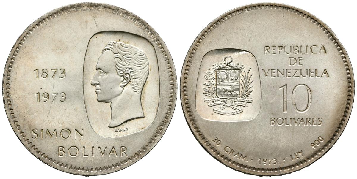 VENEZUELA. 10 Bolívares. (Ar. 30,12g/39mm). 1973. Centenario de la efigie de Simón Bolivar en la moneda (1873-1973). (Km#45). EBC.