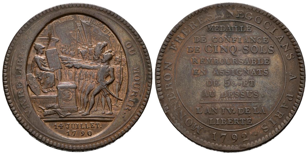 I REPUBLICA. Pacto Fedarativo. Moneda de Confianza con valor de 5 Sueldos. (Ae. 27,79g/40mm). 1792. Birmingham. Grabador: Dupre F. La escena del anverso está cargada de simbolismo: Guardias Federales ofrecen un saludo revolucionario a una figura femenina representando a Ella se sienta junto a un obelisco y sujeta tabla con las palabras “CONSTITUTION DES FRANÇAIS”. Delante de ella hay un pedestal vacio con un relieve de la cabeza de Luis XVI y detras de ella hay un escudo portando las tres Flores de Lis del escudo de armas de la realeza francesa. Debajo hay dos documentos aplastados simbolizando la retirada de privilegios a la iglesia y a la nobleza, en el canto leyenda: RHONE ET LOIRE DE GARD & DEPARTEMENS DE PARIS. (Maz.145). MBC+.