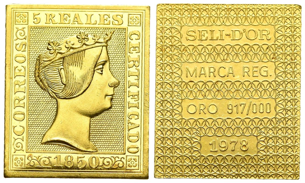 ESPAÑA. 5 Reales. (Au. 6,27g/20mm).1978. Conmemorativo de los 5 Reales de Isabel II de 1850. Oro de 0,917 milésimas. Emitido por Seli D´or. SC.