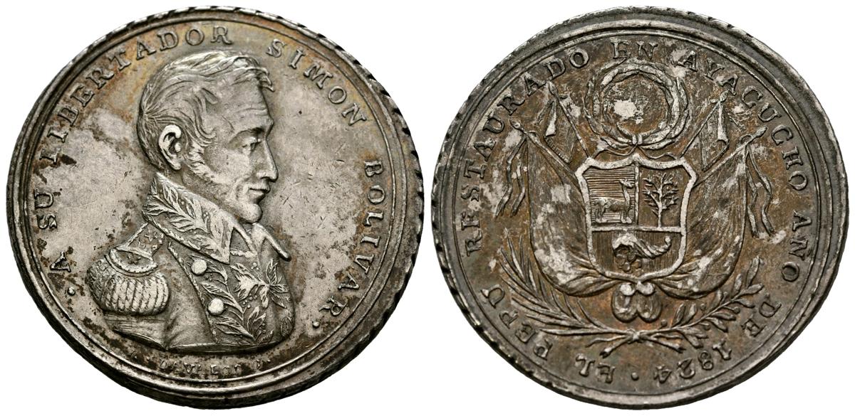 PERÚ. Batalla de Ayacucho (1824). (Ar. 15,89g33mm). 1825. Grabador: A. Dávalos. (Fonrobert-9178). Anv: busto de Simón Bolivar con busto uniformado a derecha, alrededor leyenda: A SU LIBERTADOR SIMÓN BOLIVAR. Rev: armas del Perú y alrededor leyenda: EL PERÚ RESTAURADO EN AYACUCHO AÑO DE 1824. EBC-. Preciosa pátina.
