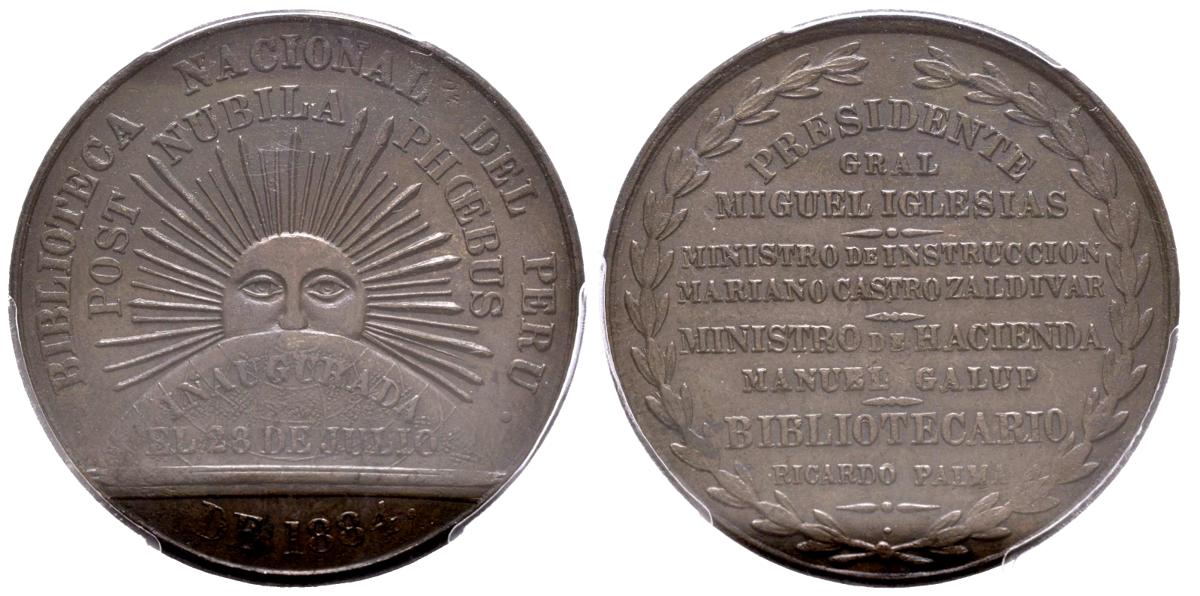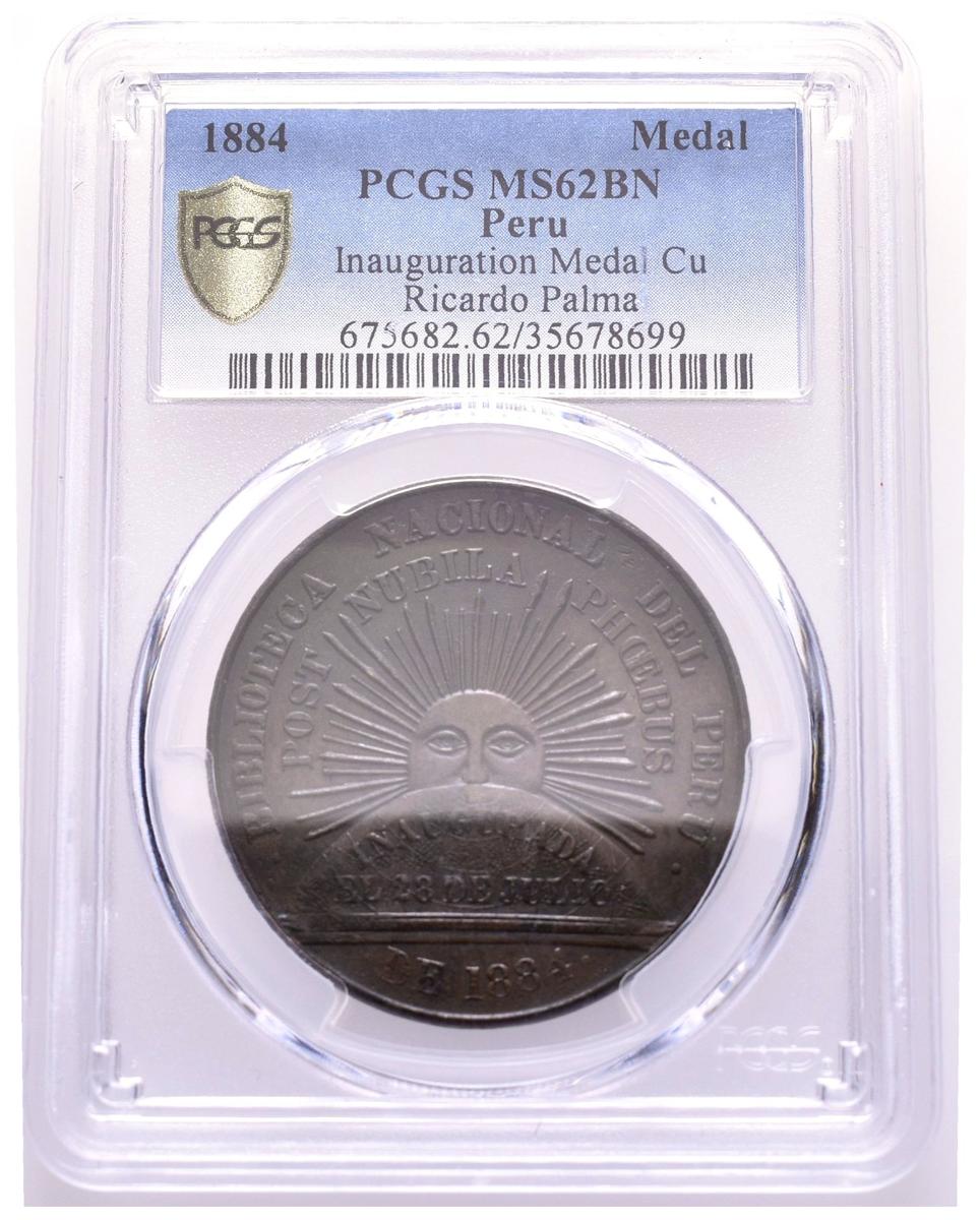 PERÚ. Inauguración Biblioteca Nacional del Perú (Ae. 20,65g/37mm)*. 1884 (28 de julio). MS62BN. Encapsulada por PCGS. Peso y medida teóricos.