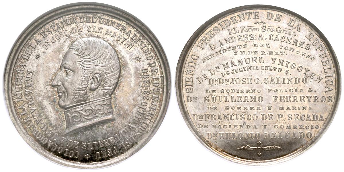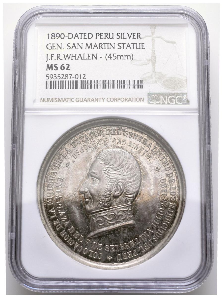 PERÚ. General San Martín (Ar. 48,25g/45mm)*. 1890. Celebración de la colocación de la primera piedra de su estatua el 28 de julio de 1890. MS62. Encapusulada por NGC. *Peso y medida teóricos.
