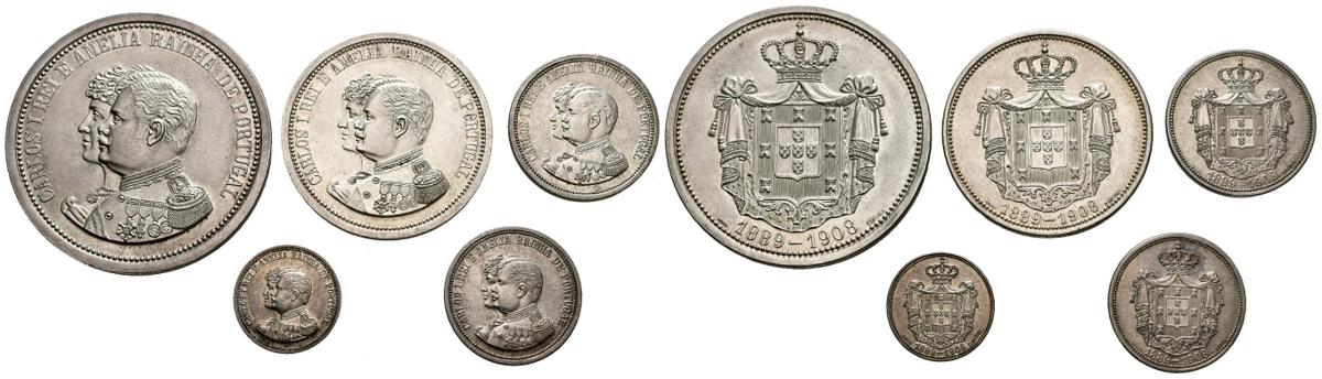 PORTUGAL. Conjunto completo de 5 medallas en plata de la serie de los Reyes de Portugal: Carlos I y Amelia (1898-1908). Diferentes módulos de Reis. Grabadores: Topazio y Antunes. SC.