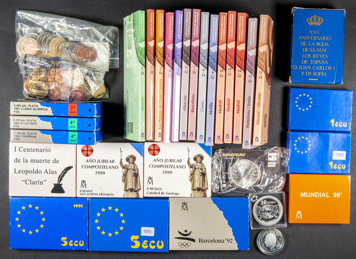 CONTEMPORÁNEO. Magnífico y extenso conjunto formado por alrededor de un centenar de estuches y sets de monedas conmemorativas españolas en su gran mayoría en plata con valores en Pesetas, Ecu y Euros. Gran variedad temática, terminaciones PROOF y muy pocos ejemplares repetidos. La mayoría de los estuches están en perfecto estado, completos e incluyendo cápsulas y certificados de autenticidad. A EXAMINAR