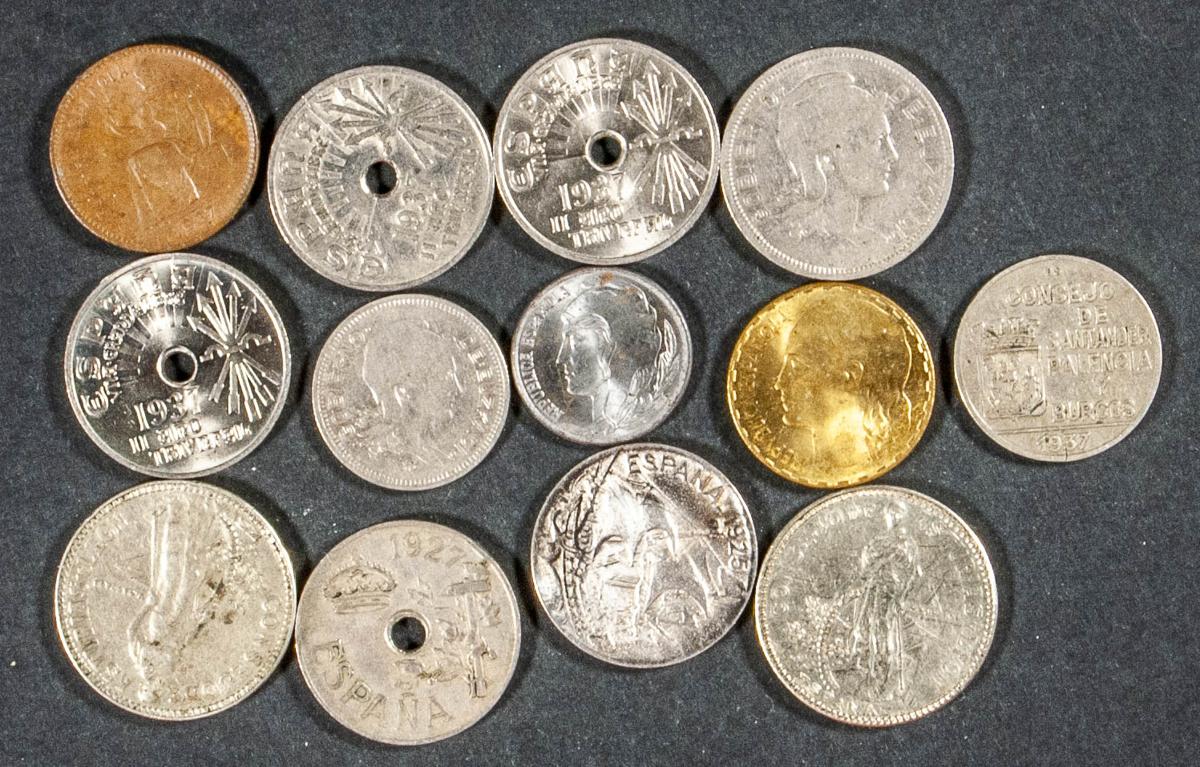 ESPAÑA. Interesante conjunto de 13 monedas acuñadas entre 1925 y 1937 durante los reinados de Alfonso XIII y el Estado Español en diferentes módulos y estados de conservación. A EXAMINAR