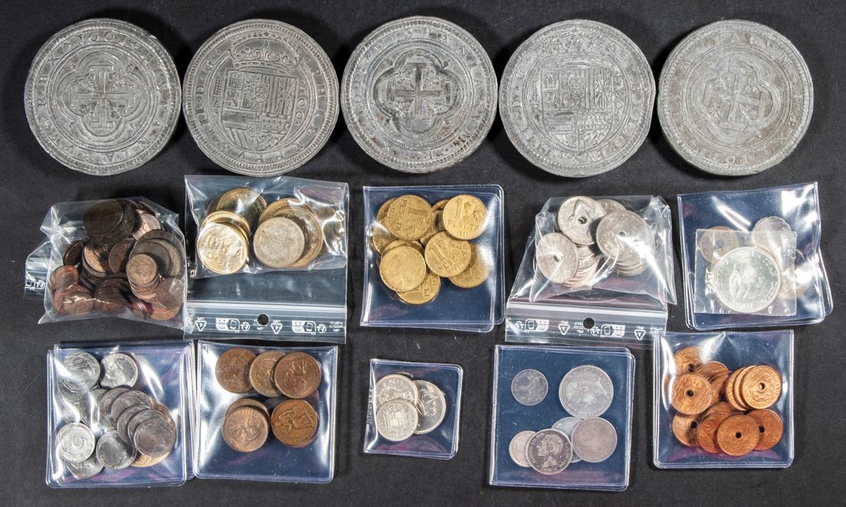 ESPAÑA. Interesante conjunto formado por alrededor de 200 monedas fundamentalmente de los periodos del Centenario de la Peseta y II República. Variedad de módulos, fechas y materiales incluyendo piezas en plata. El conjunto incluye 5 réplicas modernas de Cinquentines, 5 réplicas actuales de monedas icónicas españolas y 3 valores (1, 5 y 25 Pesetas) de 1975 en cospel de plata. El conjunto se completa con una pequeña colección de moneda chilena y mexicana. Diferentes estados de conservación, incluyendo un buen número de piezas en alto grado. IMPRESCINDIBLE EXAMINAR.