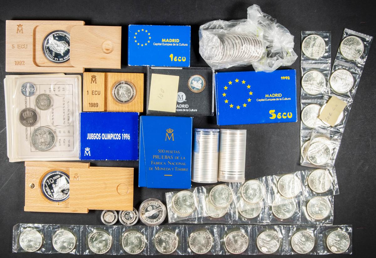 ESPAÑA. Magnífico conjunto formado por mas de 100 monedas de plata contempoánea y del Centenario de la Peseta entre las que destacan: 82 piezas de 2000 Pesetas, 18 duros del Centenario así como varios estuches de Ecus, Pesetas y 10 Euros de la serie Gaudí. Magnífico estado de conservación general. A EXAMINAR.