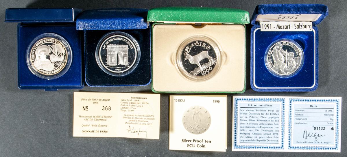 Conjunto de 4 estuches de diferentes países: Austria, Irlanda, Portugal y Francia. Piezas en plata y con estuches oficiales y certificados de autenticidad (excepto la portuguesa). PROOF.