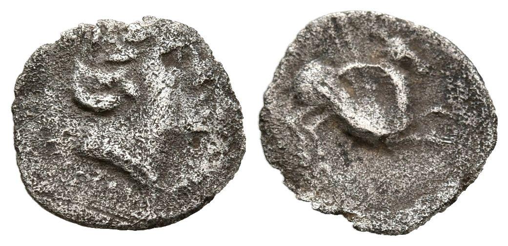 EMPORION (Ampurias, Gerona). Tritartemorion. (Ar. 0,38g/11mm). 220-215 a.C. (FAB-1105). Anv: Cabeza femenina a derecha. Rev: Pegaso volando a derecha. MBC.