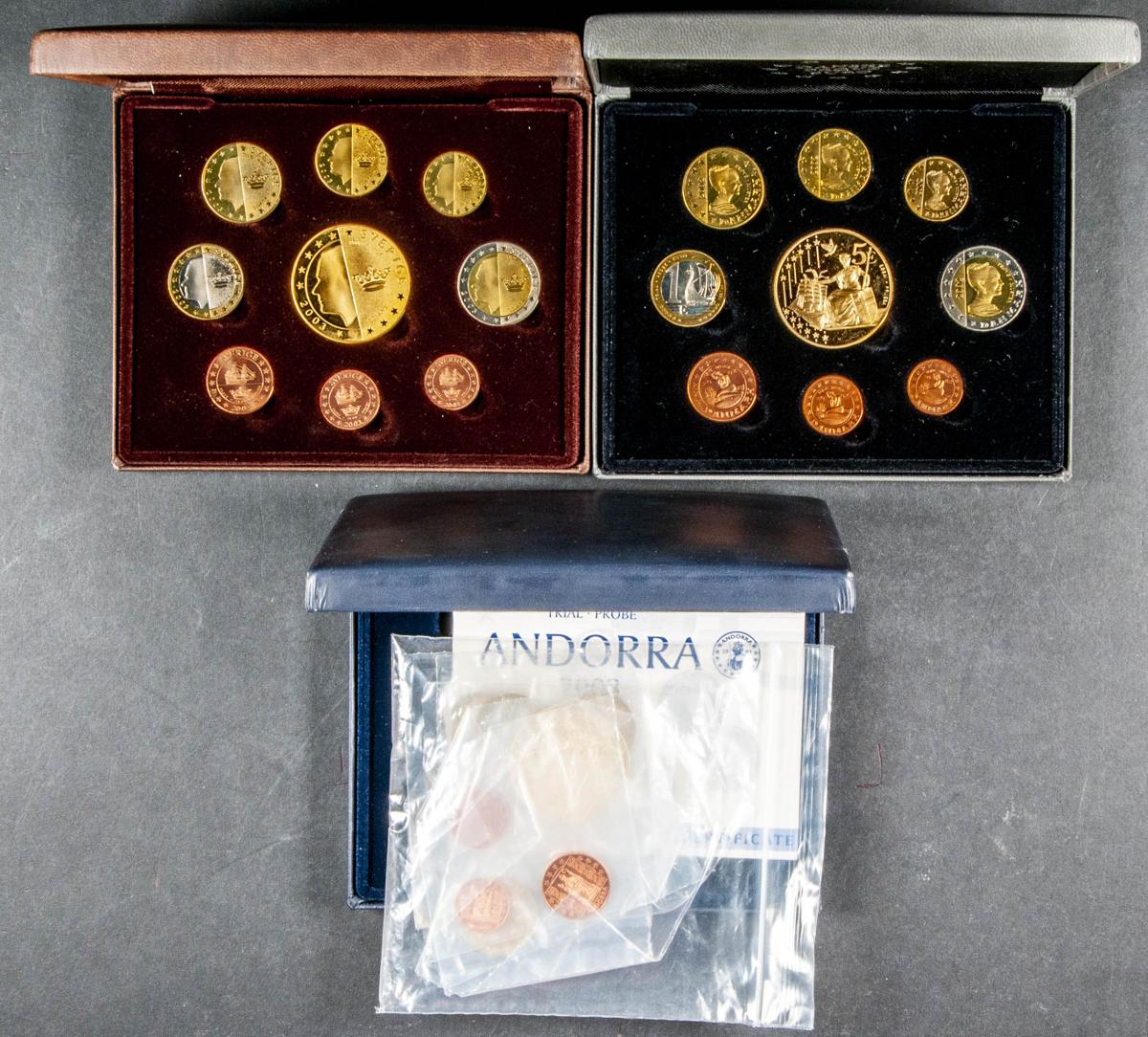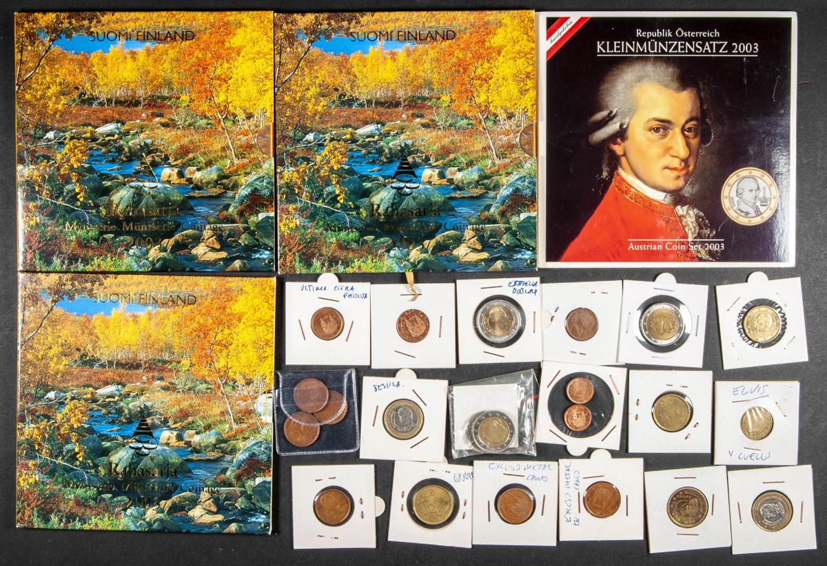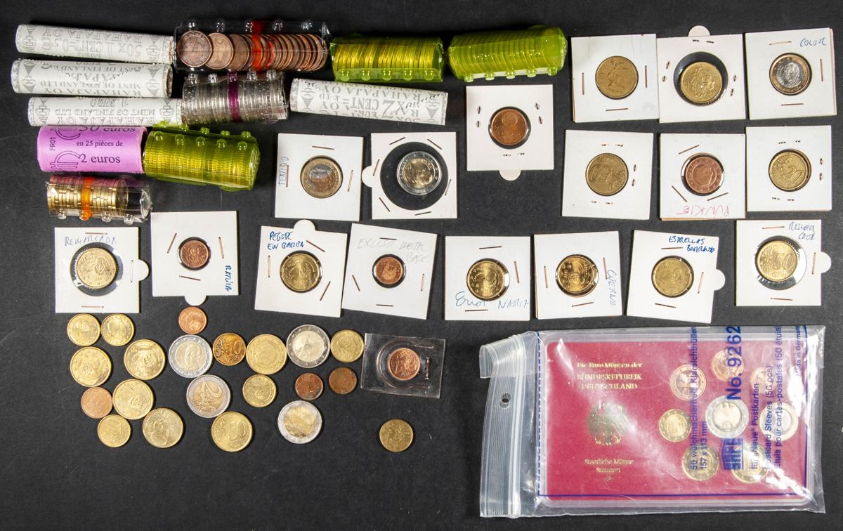 EUROS. Conjunto de Euros de diferentes países que incluyen varios set oficiales (Finlandia. Austria y Alemania) y cartuchos destancando el de 2€ de 2012 de Mónaco. Se incluyen también piezas con errores y 3 sets de "Pruebas" no oficiales de Andorra, Suecia, Dinamarca y Gran Bretaña (en plata). A EXAMINAR