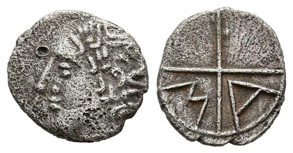 DIVISORES DE IMITACION DE MASSALIA. Trietartemorion. (Ar. 0,58g/10mm). 200-110 a.C. (FAB-1181). Anv: Cabeza masculina a izquierda. Rev: Rueda de cuatro ruedas, en el 3º y 4º cuadrante letras: M-A. MBC.